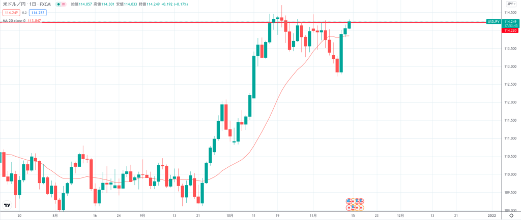 114円付近で停滞していますが、株が落ちるとリスクオフから円高になる傾向があります。