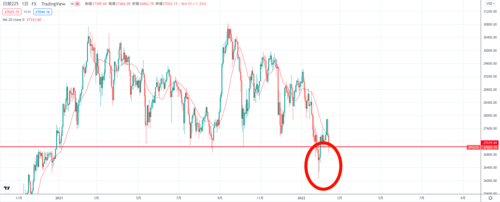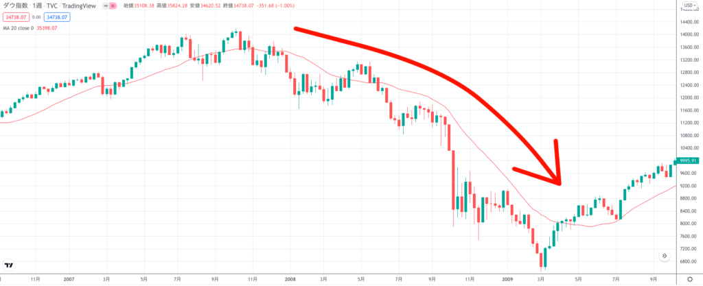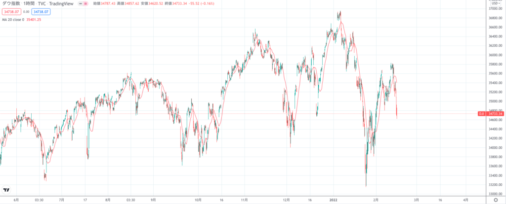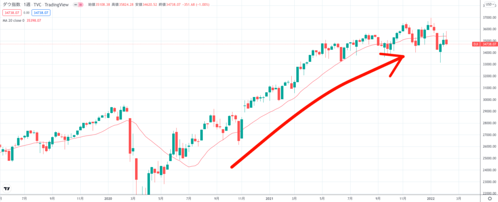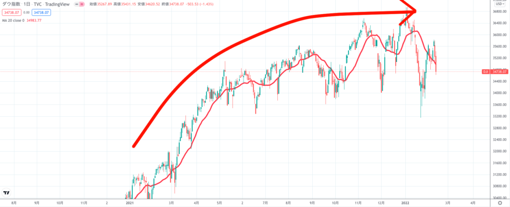 逆に下降トレンドのときは移動平均線も右肩下がりになりますが、現在のNYダウの移動平均線は横ばいになっていることで上昇トレンドから下降トレンドへ切り替わっている最中と考察できます。