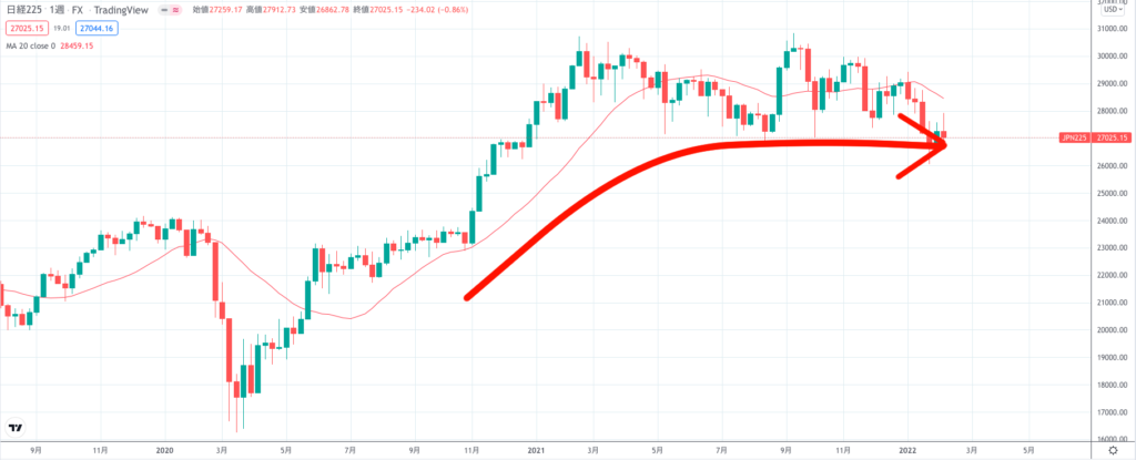さらに日経平均株価のチャートも週足で移動平均線が横ばいになっています。