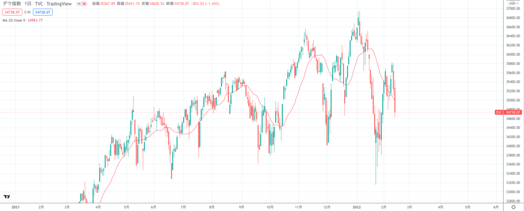 こちらはNYダウのチャートですが、日足で切り下げているのが明確になっています。