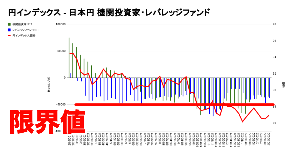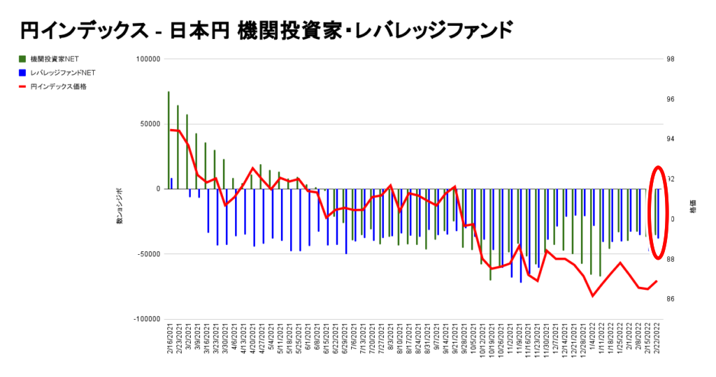 こちらは円の投機筋チャートですが、レバレッジファンドは先々週の時点で含み損を抱えていました。