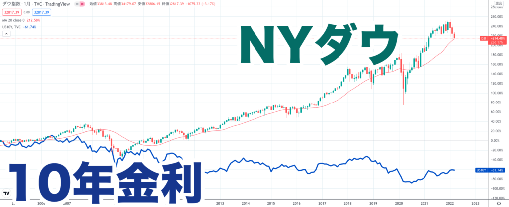 政策金利に追随する米国10年債金利がありますが、こちらは株価とは基本的に逆の動き、すなわち逆相関になる傾向があります。