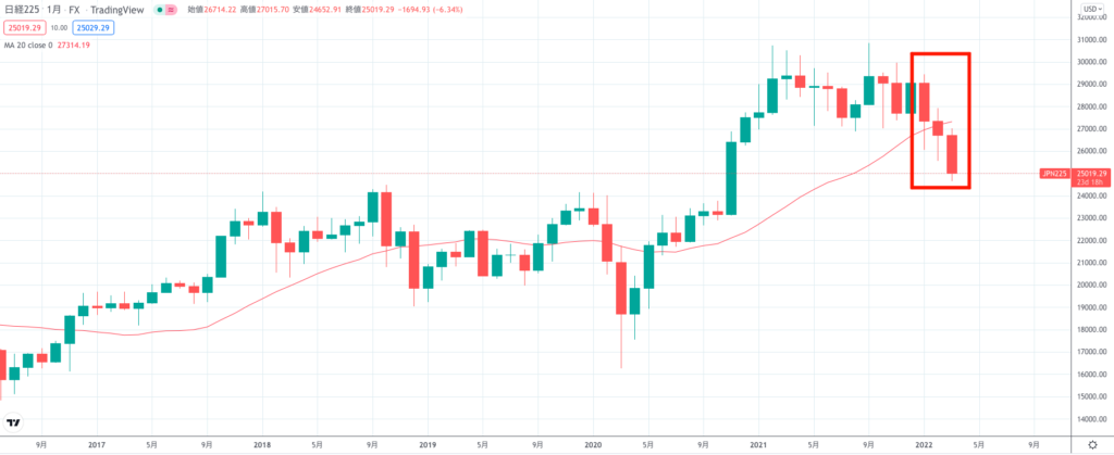 日経平均株価の現状について、月足では3本連続で陰線をつけました。