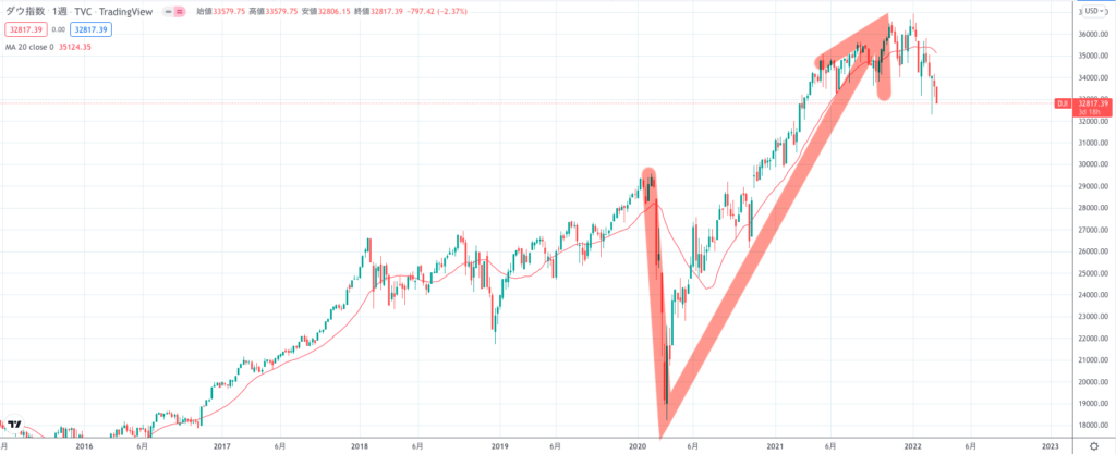 コロナショック時は株価暴落のスピードが早く、2020年2月に最高値をつけた後大暴落、翌月3月には持ち直してコロナバブルへつながりました。