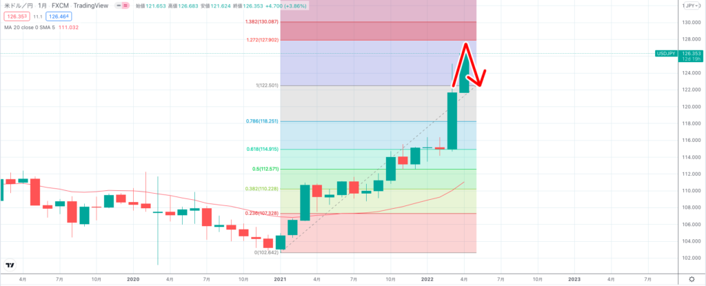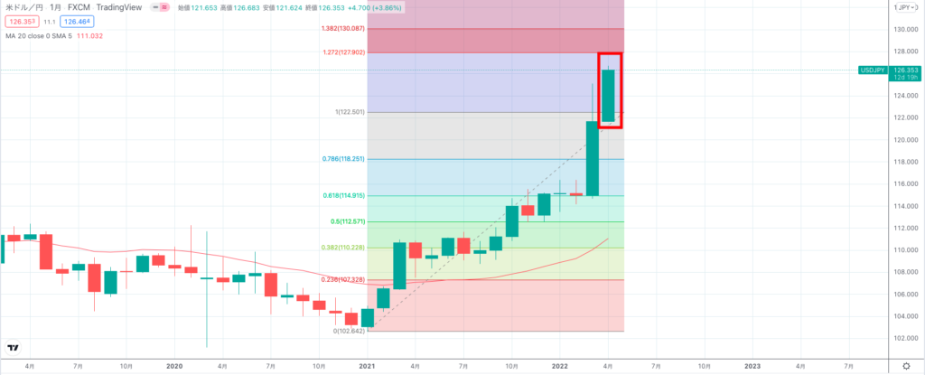 それに伴い前回の上昇トレンドに対してフィボナッチが138.2%まで上昇しました。