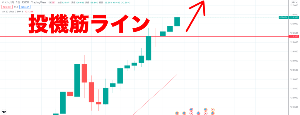 この投機筋ラインは大口投機筋・機関投資家・レバレッジファンドの相場を操る御三家が意識する傾向にあります。