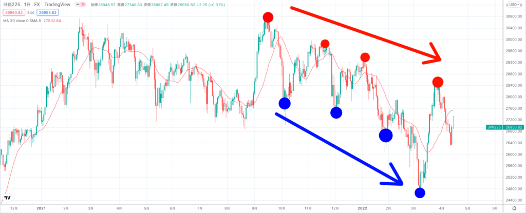 日経平均株価は波打ちながらの高値・安値ともに下落傾向にあります。