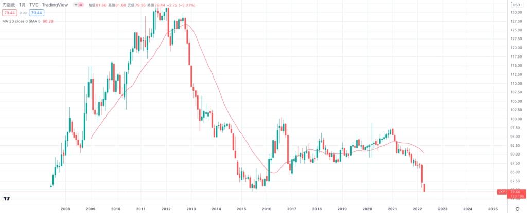 また円インデックスはついに最安値を更新し、類を見ない円安となったことが明確になりました。