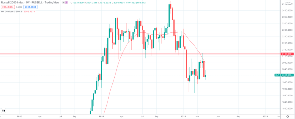 また日経平均株価と同じような動きをしているのが景気動向指数とも呼ばれるラッセル2000指数であり、こちらはレジスタンスラインでしっかり反発しています。