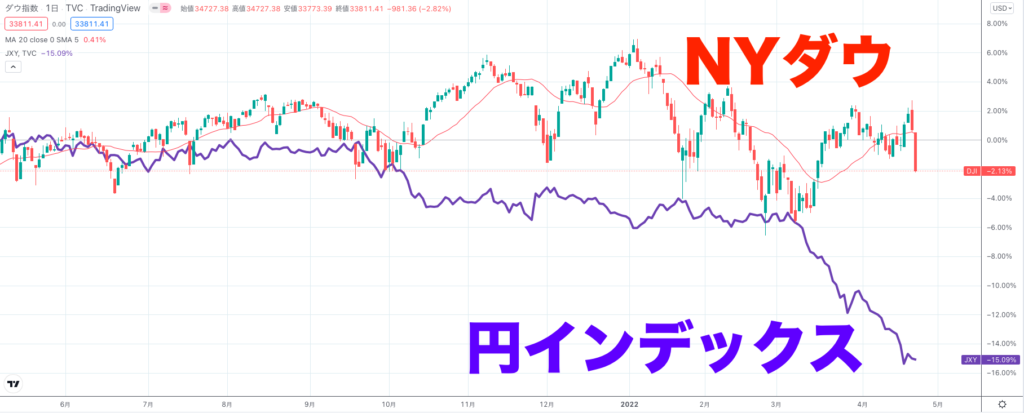 現在は株安円安となっていますが、円高へ切り替わりドル円が下がるときに本来の株安円高の連動性に戻っていくと考えています。