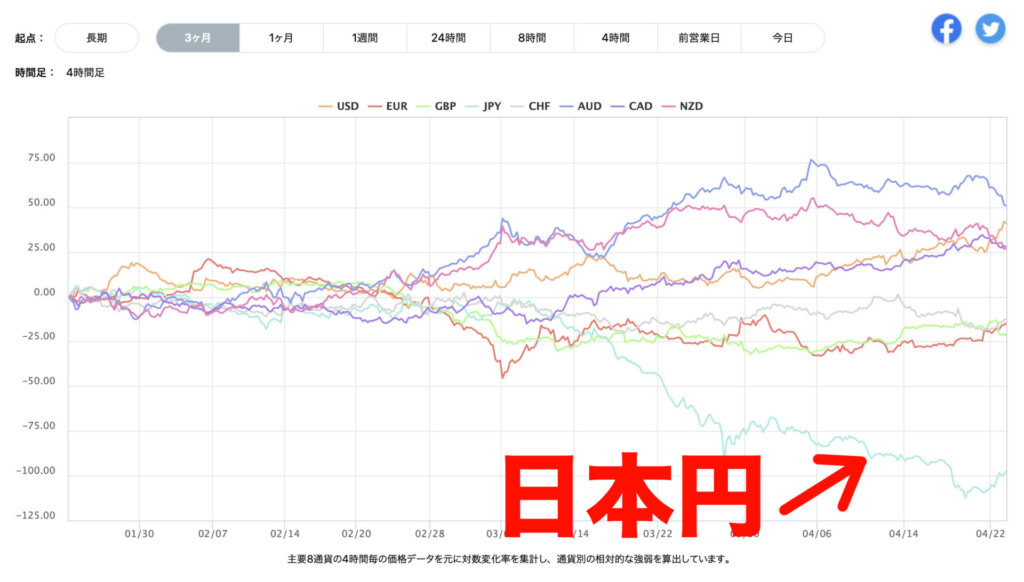 しかしリスクオフに反して円安が続いており、特に3ヶ月スパンの通貨強弱では日本円が最も弱くなっています。