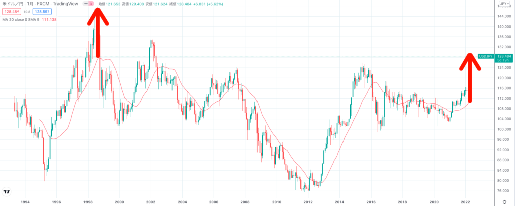 ドル円の月足の移動平均線からの乖離率を見ると、その大きさは1998年7月以来となります。