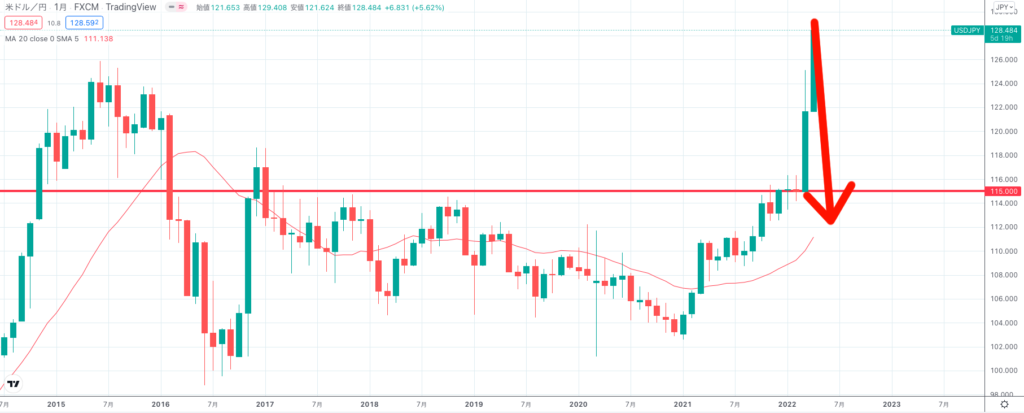 また月足の移動平均線まで落ちてくると考えると、その場合は115円割れの可能性も出てきます。
