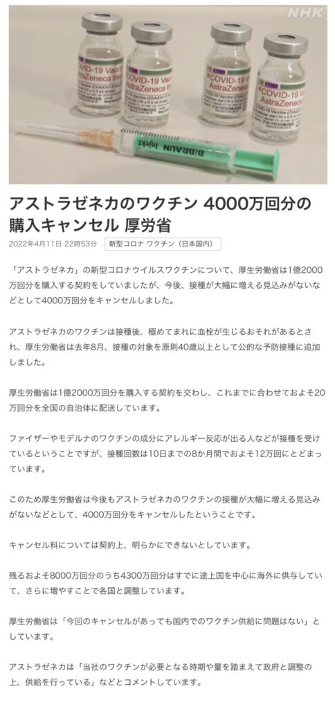 NHK NEWS WEB『アストラゼネカのワクチン 4000万回分の購入キャンセル 厚労省』より引用