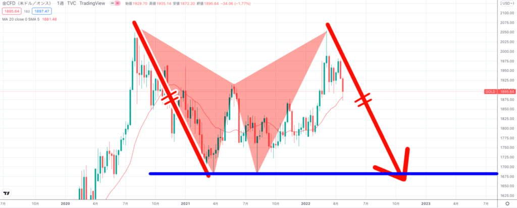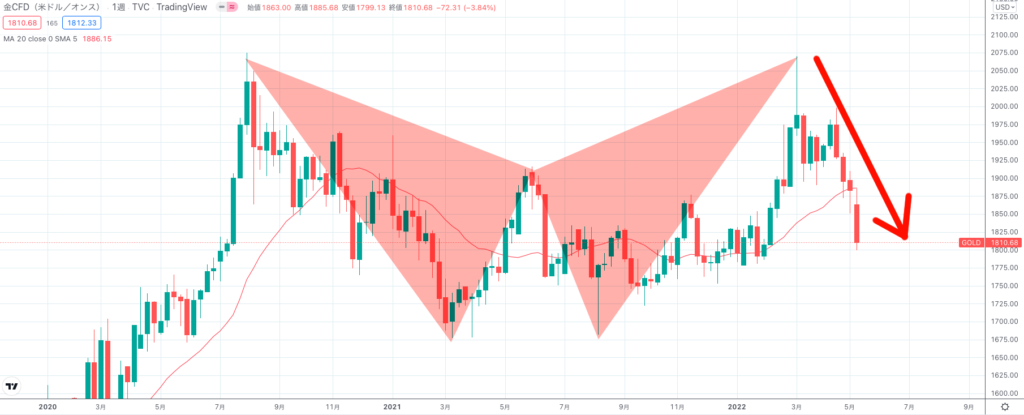 以前考察していた通り、金は週足でハーモニックパターンを描いて下落しています。