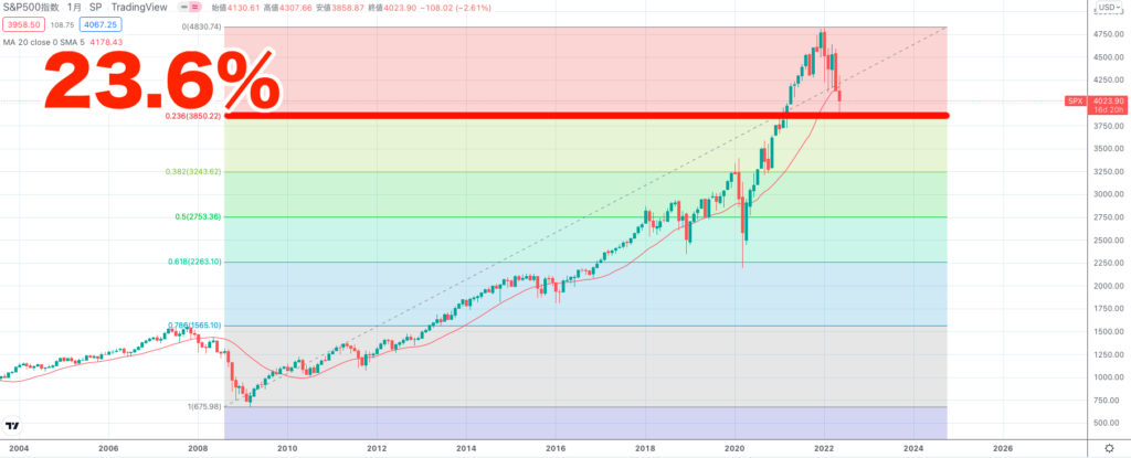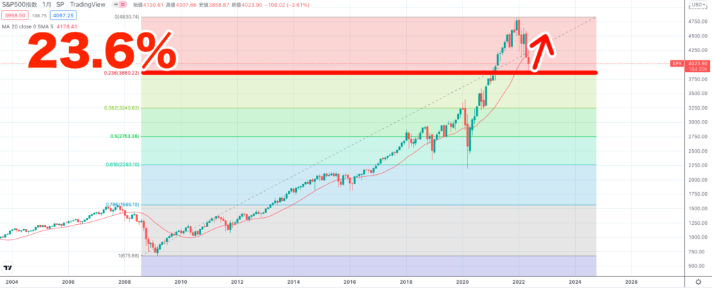 他にもリーマンショックから続いた14年間の上昇トレンドに対してフィボナッチを当てると、ちょうど23.6%戻しとなっています。