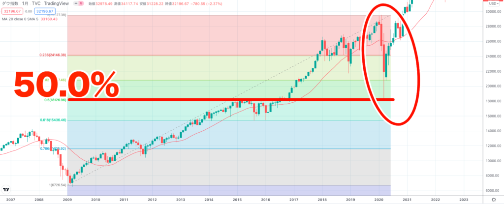 また株価が暴落する際は前回の上昇トレンドの半分まで落ちてくる傾向があり、実際にコロナショックのときにNYダウにて当てはまっていました。