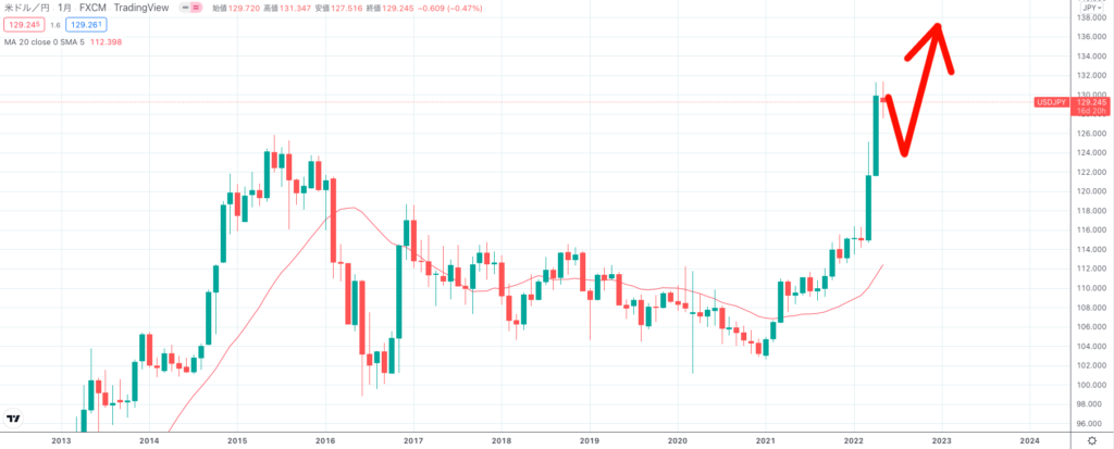 なので130円からの修正も短期的でそこまで大きく落ちず、数年スパンでは最終的に150円まで上昇してもおかしくないと考えています。