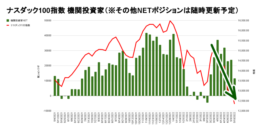 こちらは投機筋チャートになりますが、機関投資家はNYダウ・ナスダック・S&P500すべてにおいて売りの方向へ持っていっています。