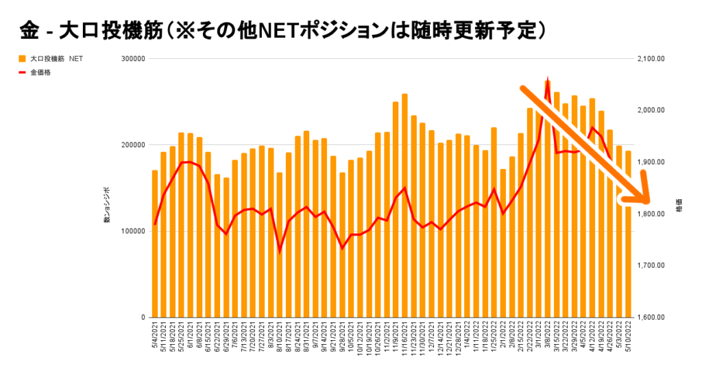 他にも金の投機筋チャートを見ると、大口投機筋も徐々に買いポジション量を減らしていることがわかります。