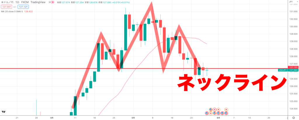 ドル円は現在、ヘッドアンドショルダーのネックライン付近にいます。