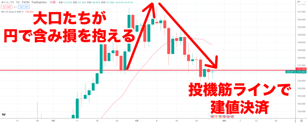 現在ネックライン付近で下げ渋っており、ここで円の買いポジションで含み損を抱えていた大口たちが建値決済を行ったことが考えられます。