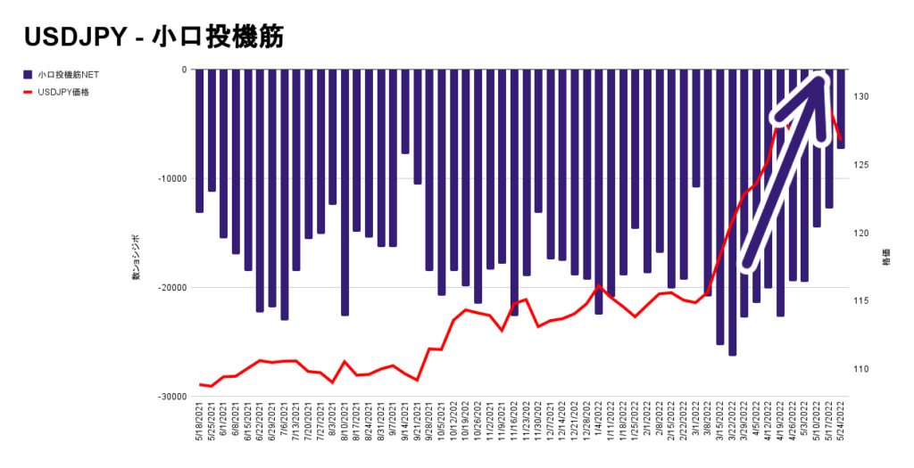 こちらは小口投機筋のドル円に対する円の投機筋チャートですが、勢いよく円の売りポジション量を解消しています。