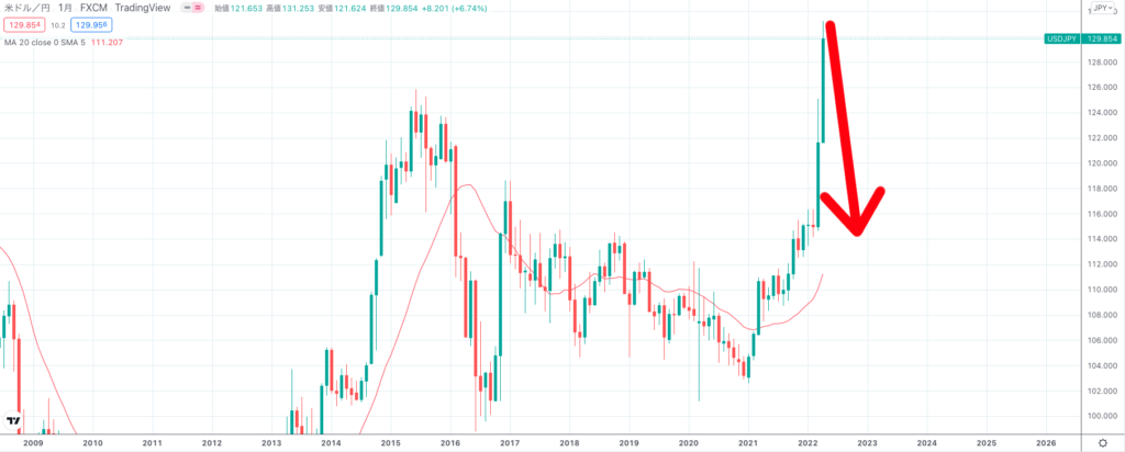 ただもっと数年単位で見ていくと修正を終えたあとに再びドル円は上昇し、最終的に150円まで行く可能性があると考えているわけです。