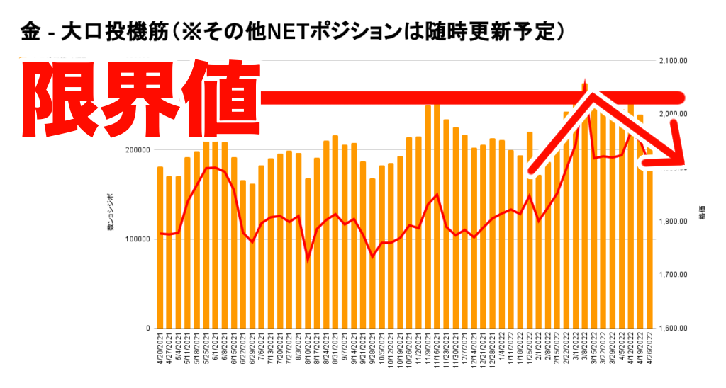 また金の投機筋チャートでも買いポジション量が限界値に来ており、ここからも買いポジション量が解消されていく動きが予想されます。