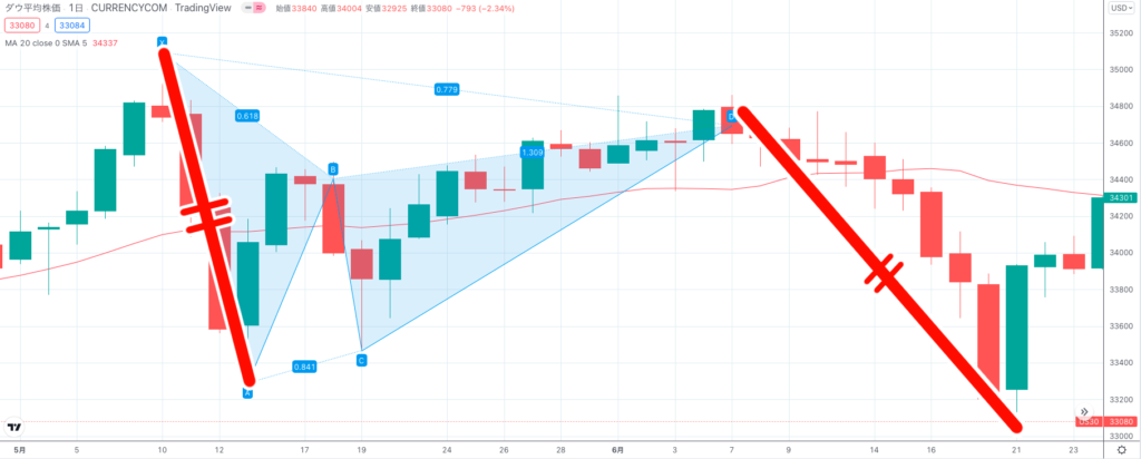 過去の例だとNYダウがハーモニックパターンを形成後に最初のトレンドと同じ長さまで下落しました。