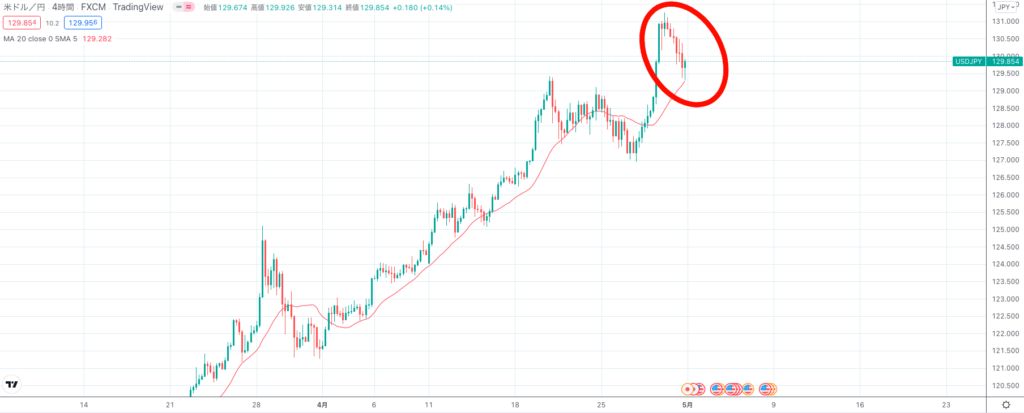 カナエさん、こんにちは。ドル円は一時130円を超えたものの、先週末にヒゲを付けて多少下落しました。
