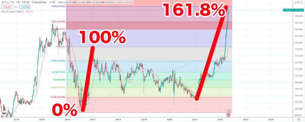 しかし予想に反して円安が進み、フィボナッチで前回の上昇トレンドを100%とすると161.8%まで上昇しました。