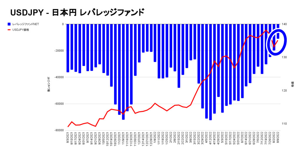 こちらはドル円に対する円の投機筋チャートですが、大口投機筋・レバレッジファンドは目立つように円の売りポジション量を解消しています。