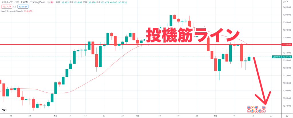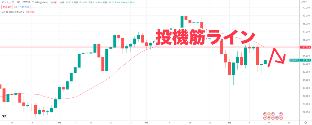 8月9日火曜日の投機筋ラインが1つの注目ポイントとなり、まずはここから円高が継続して下落する可能性が考えられます。