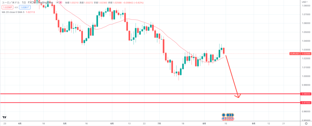 ユーロドルはもう1段階下がってもおかしくないと考えているので、そうなると0.97〜0.98ドルまで下がってきてもおかしくないと見ています。