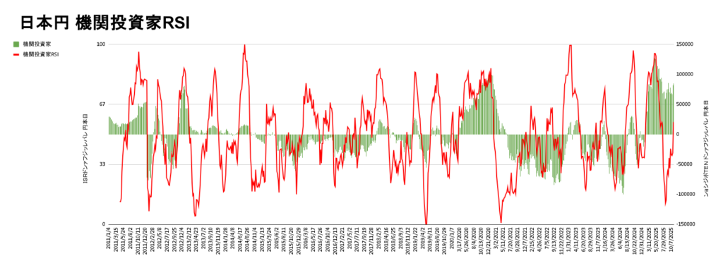 こちらはドル円の投機筋チャートに対する投機筋RSIになります。
