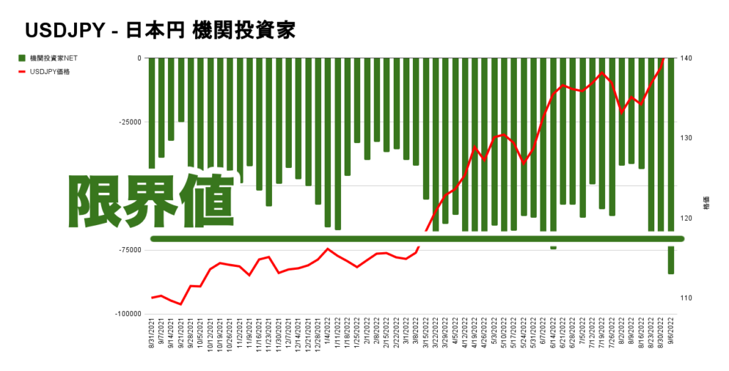 機関投資家は限界値を超えて円の売りポジション量を増加させたと見ることができます。
