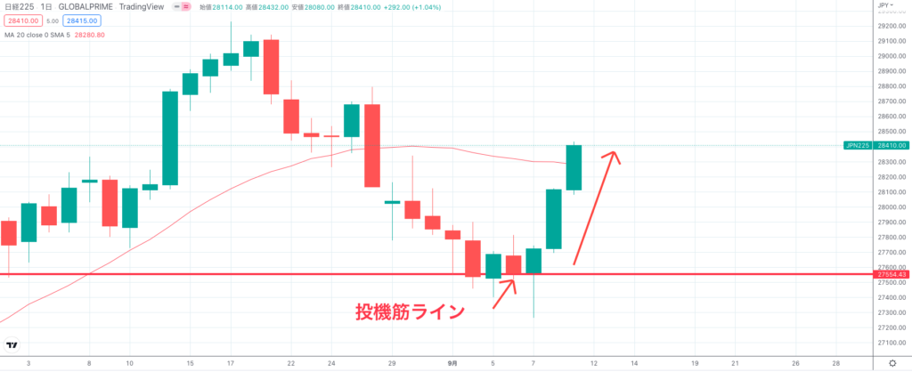 これにより日経平均株価は9月6日の投機筋ラインから一気に上昇したものと考えられます。