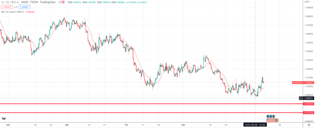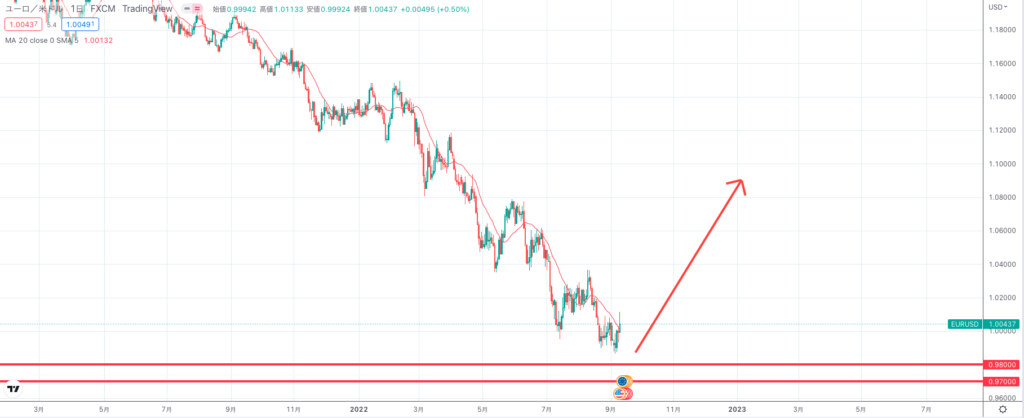 ユーロドルはすでに安値として0.98ドル台をつけており、いつ転換してもおかしくない価格帯となっています。