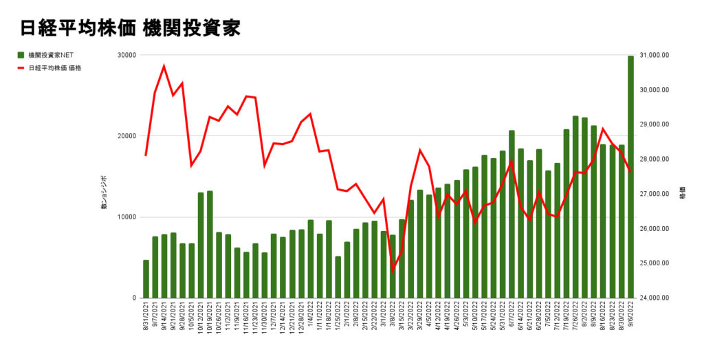 こちらは日経平均株価の投機筋チャートですが、機関投資家が一気に買いポジション量を増やしました。