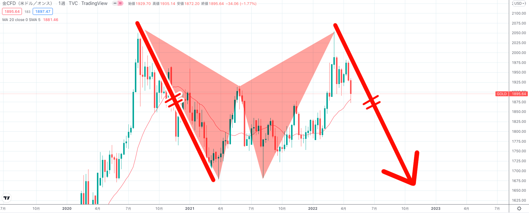 金(ゴールド)はハーモニックパターン通りに下落へ。