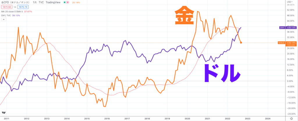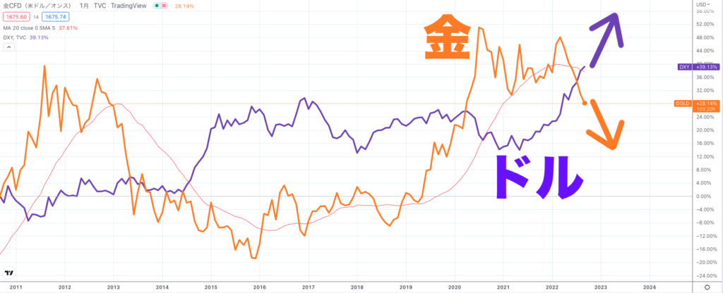 金とドルは基本的に逆の動き、すなわち逆相関になる傾向にあります。
