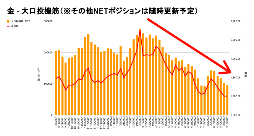 また金の投機筋チャートを見ると、2022年3月からずっと買いポジション量を解消させています。