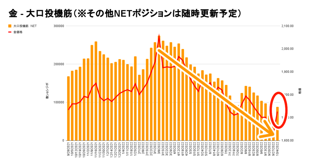 金も大幅に落ちたことから、投機筋チャートから見てもそろそろ買いに転じてもおかしくないと考えています。