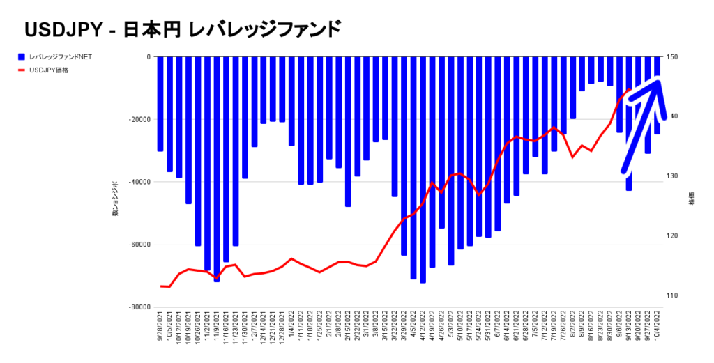 こちらはドル円に対する円の投機筋チャートになりますが、機関投資家やレバレッジファンドは徐々に円の売りポジション量を解消しています。