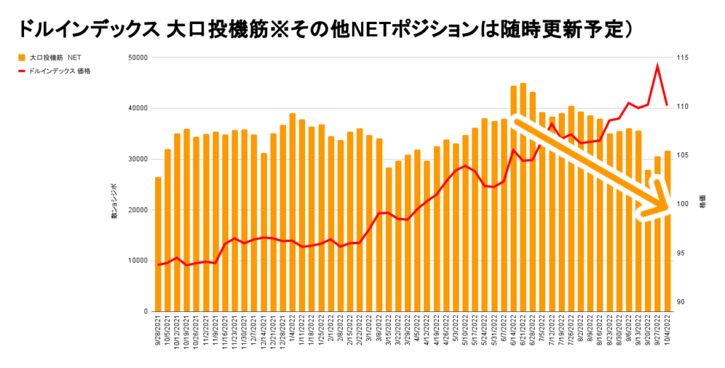 またドル円に対するドルの投機筋チャートを見ても、大口投機筋がドルの買いポジション量を解消してきています。