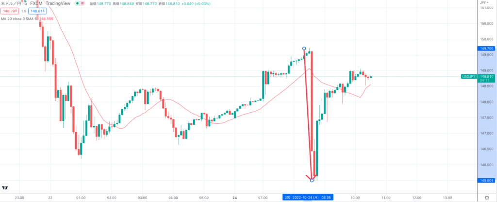 数分間でドル円が4円前後円高に。再び為替介入が入ったか。