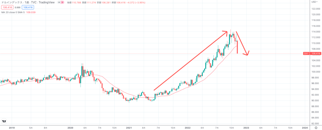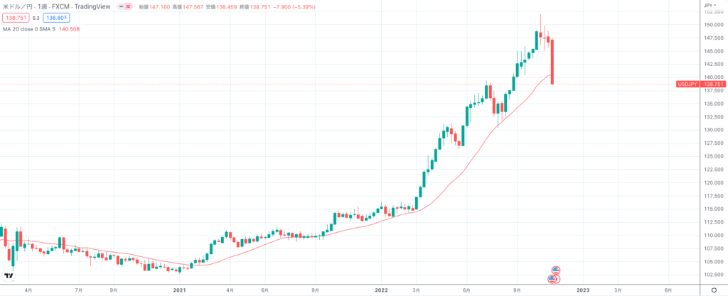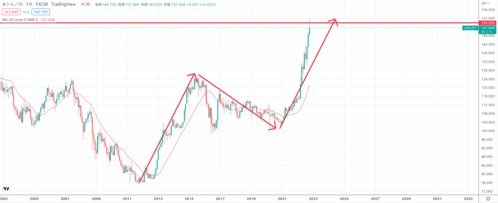 ドル円の場合、2022年5月時点で月足のトレンドの長さが同じになるまで上昇すると予想していました。