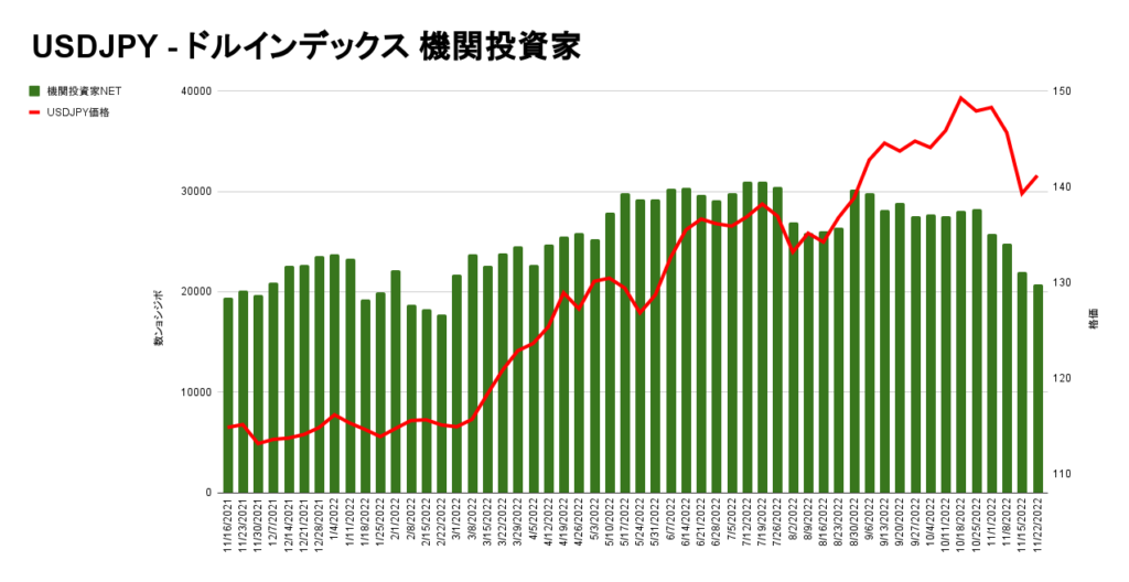 またドル円に対するドルインデックスの投機筋チャートでは、大口投機筋と機関投資家がドルの買いポジション量を解消してきています。