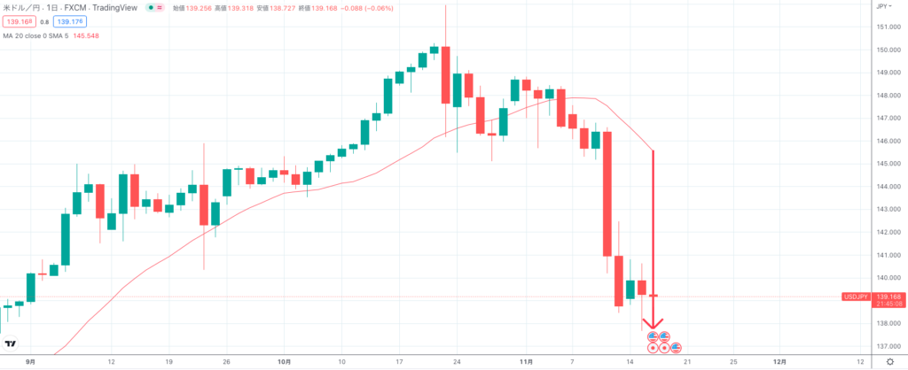 僕がドル円を右ストレートで狙った理由は大陰線が出たことでオーバーシュートになったからです。